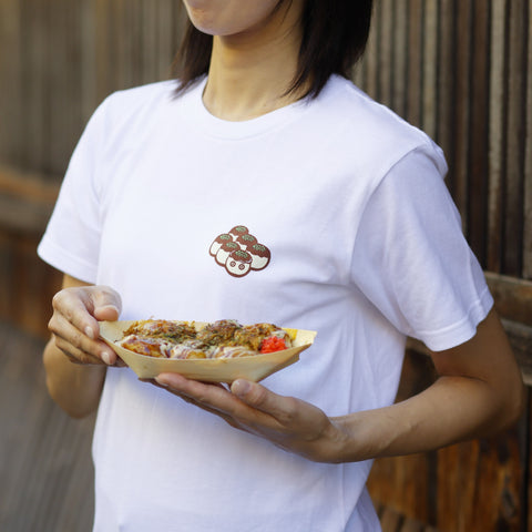 Lifestyle photo of a person wearing a white “Takoyaki” T-shirt, holding a tray of takoyaki in front of a wooden lattice.