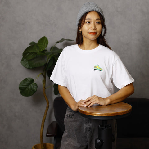 Model wearing a white tee with a small Shiba Inu pocket-style graphic.
