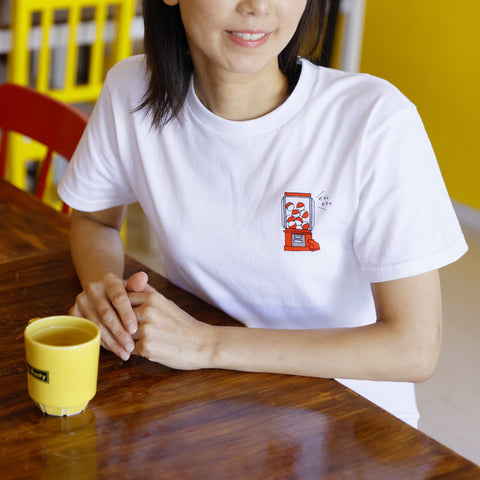 Row of white graphic T-shirts on hangers, featuring small chest art (gachapon, ninja) at ONE POINT.